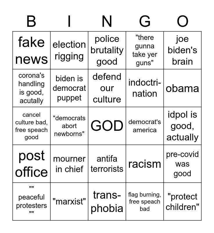 This bingo card has a free space and 24 words: mourner in chief, "marxist", defend our culture, "" peaceful protesters "", joe biden's brain, fake news, corona's handling is good, acutally, election rigging, democrat's america, antifa terrorists, indoctri-nation, cancel culture bad, free speach good, racism, pre-covid was good, biden is democrat puppet, flag burning, free speach bad, idpol is good, actually, police brutality good, obama, "democrats abort newborns", "protect children", post office, "there gunna take yer guns" and trans-phobia.