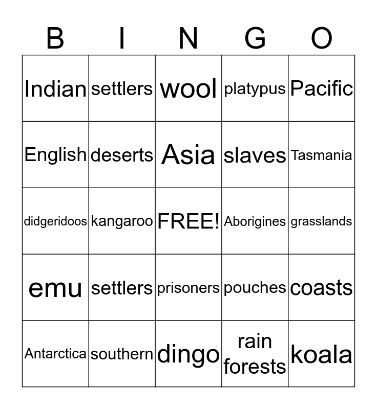 This bingo card has a free space and 24 words: settlers, southern, Asia, Antarctica, Pacific, Indian, English, settlers, Aborigines, prisoners, slaves, didgeridoos, pouches, coasts, deserts, rain forests, grasslands, wool, Tasmania, kangaroo, koala, emu, platypus and dingo.