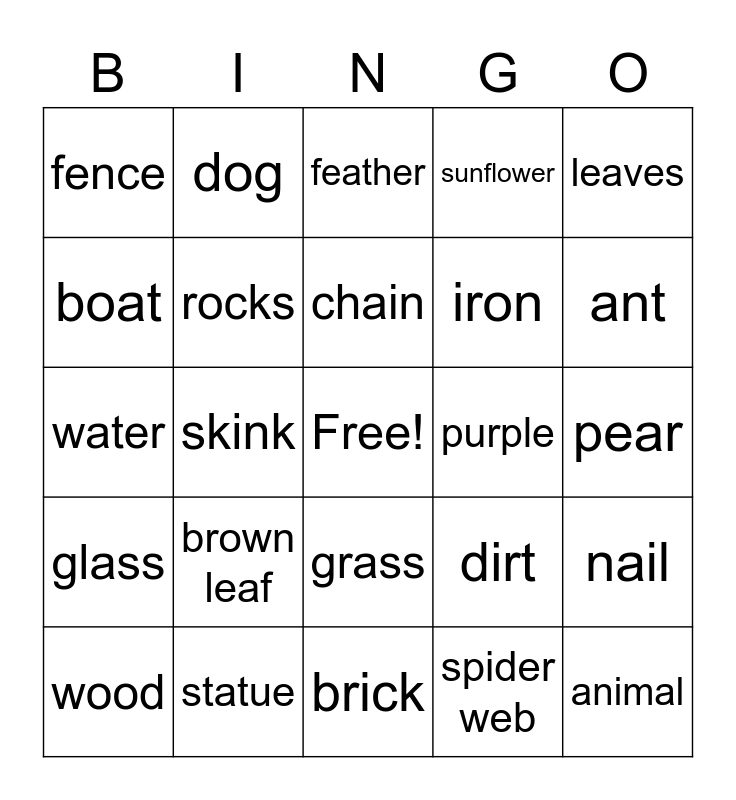 This bingo card has a free space and 24 words: wood, brown leaf, chain, spider web, leaves, fence, dog, feather, purple, pear, water, rocks, dirt, nail, boat, statue, brick, sunflower, ant, glass, skink, grass, iron and animal.