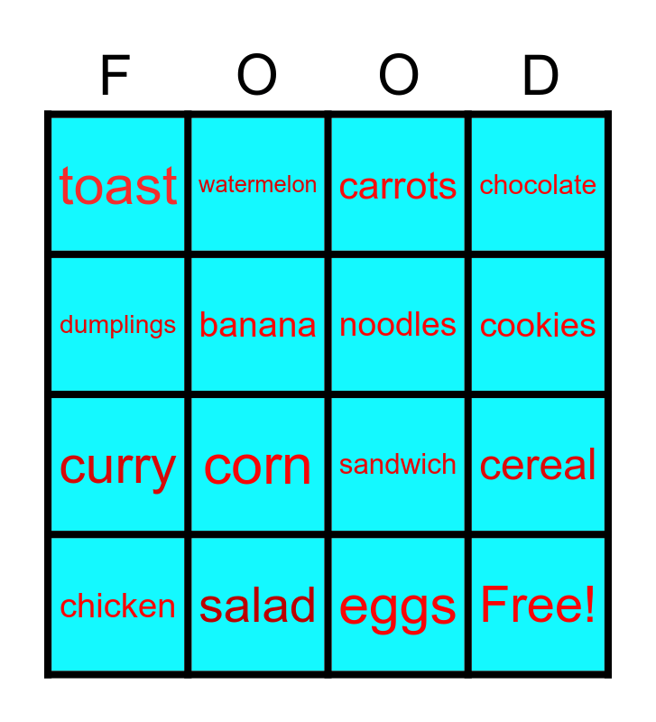This bingo card has 16 words: salad, cereal, carrots, toast, curry, watermelon, sandwich, eggs, dumplings, banana, chicken, chocolate, corn, cookies, noodles and Free!.