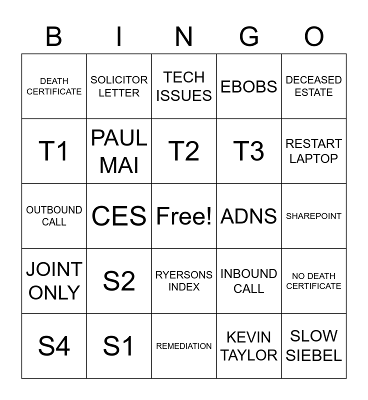 This bingo card has a free space and 24 words: S2, S1, T2, S4, DECEASED ESTATE, DEATH CERTIFICATE, T1, SOLICITOR LETTER, ADNS, RYERSONS INDEX, T3, OUTBOUND CALL, INBOUND CALL, NO DEATH CERTIFICATE, PAUL MAI, KEVIN TAYLOR, SHAREPOINT, TECH ISSUES, RESTART LAPTOP, CES, SLOW SIEBEL, JOINT ONLY, EBOBS and REMEDIATION.