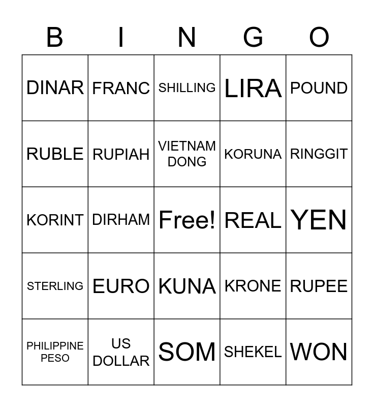 This bingo card has a free space and 24 words: EURO, US DOLLAR, VIETNAM DONG, PHILIPPINE PESO, POUND, DINAR, RUBLE, FRANC, REAL, KUNA, KORUNA, KORINT, KRONE, RUPEE, RUPIAH, SHEKEL, YEN, SHILLING, RINGGIT, DIRHAM, WON, STERLING, LIRA and SOM.