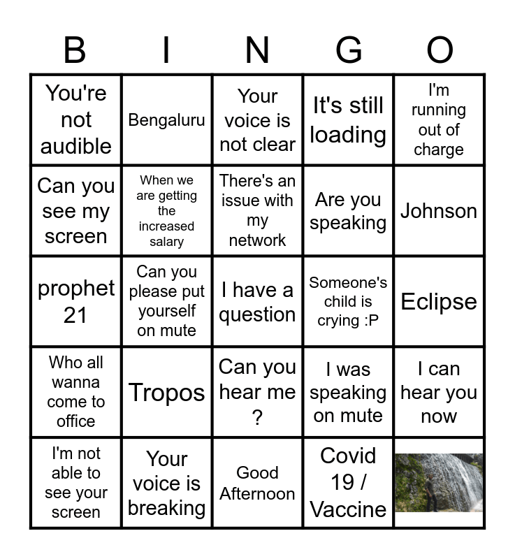 This bingo card has 1 images and 25 words: Can you hear me ?, Covid 19 / Vaccine, There's an issue with my network, Your voice is breaking, I'm running out of charge, You're not audible, Can you see my screen, Bengaluru, Eclipse, I was speaking on mute, Are you speaking, prophet 21, I can hear you now, I'm not able to see your screen, Can you please put yourself on mute, Unprecedented Time, It's still loading, Who all wanna come to office, Your voice is not clear, I have a question, Johnson, Good Afternoon, Someone's child is crying :P, Tropos and When we are getting the increased salary.