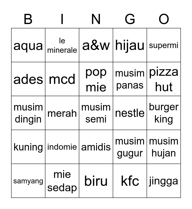 This bingo card has a free space and 24 words: indomie, mie sedap, pop mie, samyang, supermi, aqua, ades, le minerale, nestle, amidis, musim panas, musim dingin, musim gugur, musim hujan, mcd, kfc, burger king, a&w, pizza hut, merah, jingga, kuning, hijau and biru.