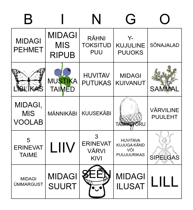 This bingo card has 6 images, a free space and 24 words: LIIV, MIDAGI SUURT, HUVITAV PUTUKAS, MIDAGI ÜMMARGUST, SÕNAJALAD, MIDAGI PEHMET, LIBLIKAS, MIDAGI MIS RIPUB, TAMMETÕRU, 3 ERINEVAT VÄRVI KIVI, MIDAGI KUIVANUT, MIDAGI, MIS VOOLAB, HUVITAVA KUJUGA KÄND VÕI PUUJUURIKAS, SIPELGAS, MUSTIKA TAIMED, MIDAGI ILUSAT, VÄRVILINE PUULEHT, RÄHNI TOKSITUD PUU, SAMMAL, MÄNNIKÄBI, LILL, 5 ERINEVAT TAIME, Y-KUJULINE PUUOKS and SEEN.