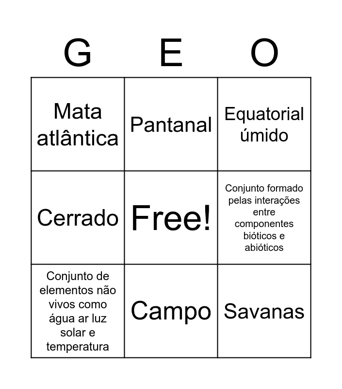 This bingo card has a free space and 20 words: Cerrado, Seis biomas, Equatorial úmido, Saara, Caatinga, Savanas, Pampa, Mata atlântica, Amazônia, Pantanal, Rios lagos mares e oceanos, Local onde um ser vivo vive, Conjunto formado pelas interações entre componentes bióticos e abióticos, Conjunto de seres vivos de um determinado ambiente como plantas e animais que ali vivem, Conjunto de elementos não vivos como água ar luz solar e temperatura, Mata Atlântica, Campo, Cerrado, Tundra and Floresta tropical.