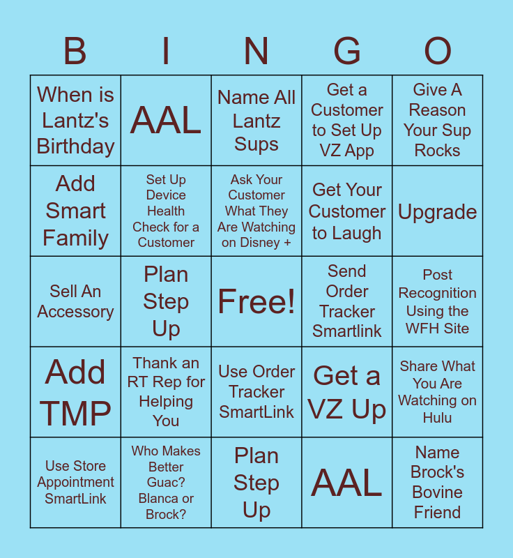 This bingo card has a free space and 29 words: Use Store Appointment SmartLink, Add A Val Gen Feature, Plan Step Up, Tell A Customer About Mix and Match 3.0, When is Lantz's Birthday, Name All Lantz Sups, Set Up Device Health Check for a Customer, Thank an RT Rep for Helping You, Send Order Tracker Smartlink, Who Makes Better Guac? Blanca or Brock?, Post Recognition Using the WFH Site, Name Brock's Bovine Friend, Plan Step Up, AAL, Upgrade, Get Lantz to Share a Recipe, Use Order Tracker SmartLink, Add TMP, Give A Reason Your Sup Rocks, Sell An Accessory, Get a VZ Up, Use Device Support SmartLink, Get Your Customer to Laugh, Add Smart Family, Get a Customer to Set Up VZ App, AAL, Share What You Are Watching on Hulu, Ask Your Customer What They Are Watching on Disney + and Upgrade.