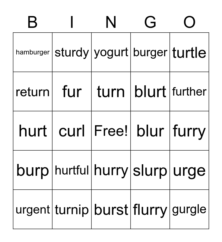 This bingo card has a free space and 35 words: church, purse, nurse, fur, hurry, burger, return, purple, turn, Saturday, hurt, turtle, Thursday, curve, hamburger, blur, flurry, curl, burp, gurgle, slurp, urgent, urge, turnip, yogurt, further, curb, purr, blurt, furry, curse, burst, hurtful, sturdy and burn.