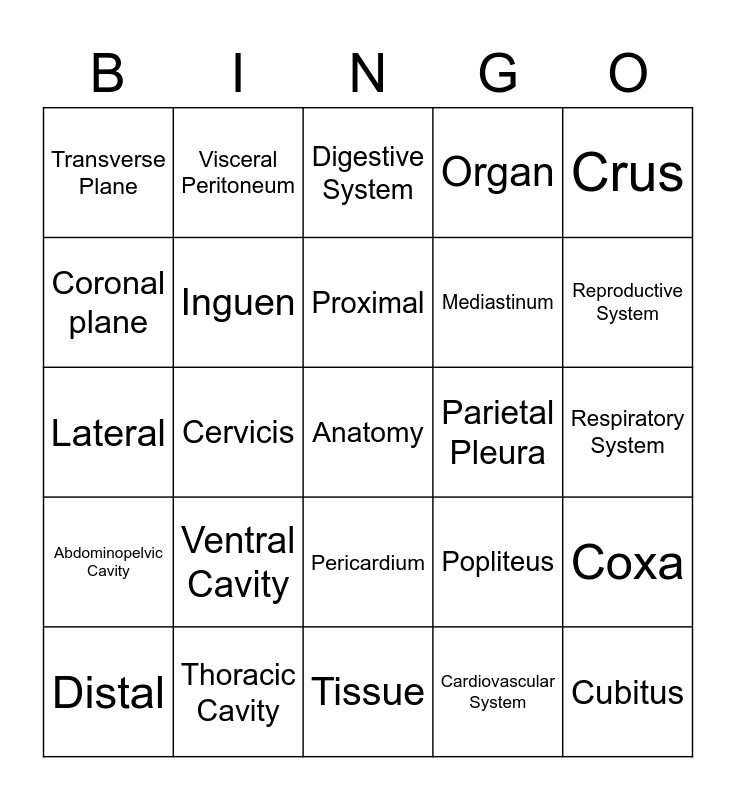 This bingo card has a free space and 24 words: Ventral Cavity, Thoracic Cavity, Proximal, Distal, Crus, Transverse Plane, Coronal plane, Visceral Peritoneum, Parietal Pleura, Pericardium, Mediastinum, Lateral, Popliteus, Coxa, Inguen, Cardiovascular System, Respiratory System, Digestive System, Reproductive System, Cervicis, Cubitus, Abdominopelvic Cavity, Organ and Tissue.