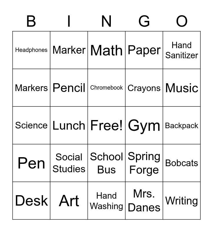 This bingo card has a free space and 34 words: Sixth Grade, Mrs. Danes, Miss Wilson, Mask, Pen, Pencil, Hand Sanitizer, Desk, Marker, Eraser, Chromebook, Math, Reading, Library, Gym, Music, Art, Science, Social Studies, Spring Forge, School Bus, Teacher, Headphones, Backpack, Hand Washing, Writing, Paper, Google, Crayons, Markers, Recess, Lunch, Bobcats and Lunchbox.