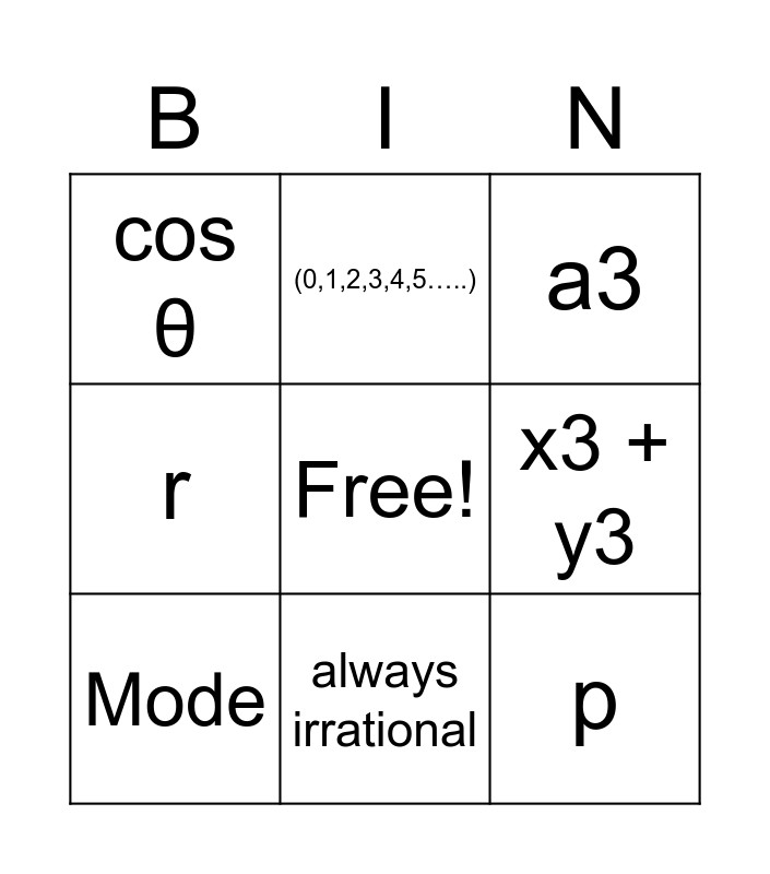 This bingo card has a free space and 13 words: a2 + b2 + 2ab, π r2, Mode, (0,1,2,3,4,5…..), r, p, 2m + 1, may or may not be greater than the radius of circle, always irrational, cos θ, x3 + y3, a3 and P = a + b + c.