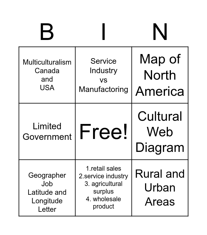 This bingo card has a free space and 8 words: Cultural Web Diagram, Map of North America, Service Industry vs Manufactoring, Geographer Job Latitude and Longitude Letter, Multiculturalism Canada and USA, Rural and Urban Areas, Limited Government and 1.retail sales 2.service industry 3. agricultural surplus 4. wholesale product.