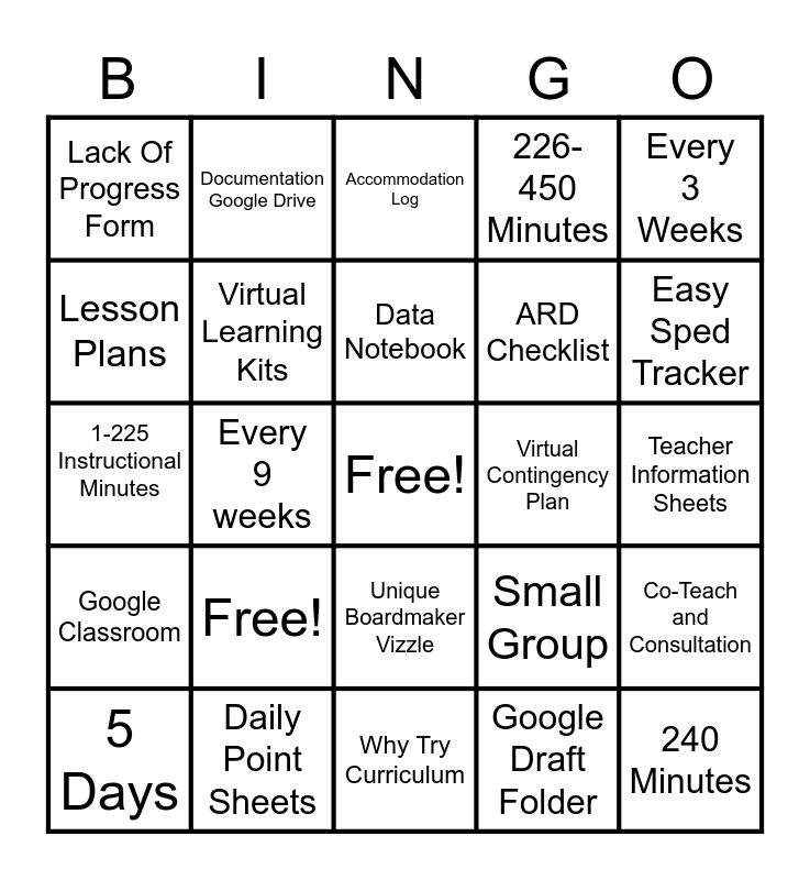 This bingo card has a free space and 24 words: 5 Days, Free!, Data Notebook, Google Draft Folder, Every 3 Weeks, Lack Of Progress Form, Documentation Google Drive, Accommodation Log, Virtual Contingency Plan, Teacher Information Sheets, 1-225 Instructional Minutes, Virtual Learning Kits, Small Group, Co-Teach and Consultation, Lesson Plans, Daily Point Sheets, Why Try Curriculum, 226-450 Minutes, Easy Sped Tracker, Google Classroom, Every 9 weeks, Unique Boardmaker Vizzle, ARD Checklist and 240 Minutes.