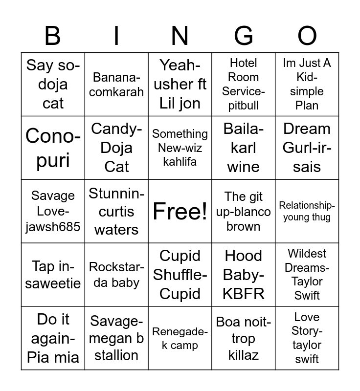 This bingo card has a free space and 24 words: Rockstar-da baby, Savage-megan b stallion, Something New-wiz kahlifa, Do it again- Pia mia, Im Just A Kid- simple Plan, Say so-doja cat, Cono-puri, Banana-comkarah, The git up-blanco brown, Cupid Shuffle- Cupid, Baila- karl wine, Savage Love-jawsh685, Hood Baby- KBFR, Wildest Dreams-Taylor Swift, Candy-Doja Cat, Boa noit-trop killaz, Relationship-young thug, Yeah- usher ft Lil jon, Dream Gurl-ir-sais, Stunnin-curtis waters, Love Story-taylor swift, Tap in-saweetie, Hotel Room Service-pitbull and Renegade- k camp.