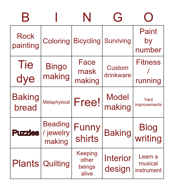 This bingo card has a free space and 24 words: Beading / jewelry making, Quilting, Face mask making, Plants, Paint by number, Rock painting, Tie dye, Coloring, Model making, Funny shirts, Custom drinkware, Baking bread, Baking, Blog writing, Bingo making, Interior design, Yard improvements, Bicycling, Fitness / running, Metaphysical, Learn a musical instrument, Puzzles, Surviving and Keeping other beings alive.