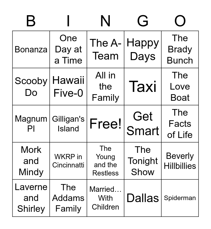This bingo card has a free space and 63 words: Cheers, Disney, Dukes of Hazzard, Beverly Hillbillies, Littlest Hobo, Golden Girls, One Day at a Time, The Jeffersons, All in the Family, Fresh Prince of Bel-Air, The Young and the Restless, Different Strokes, The Facts of Life, The Brady Bunch, The Partridge Family, Scooby Do, Gilligan's Island, Bonanza, The Flintstones, Taxi, WKRP in Cincinnatti, Mork and Mindy, Happy Days, The Mary Tyler Moore Show, M*A*S*H, Hogan's Heroes, Green Acres, Mission: Impossible, The Waltons, Friends, Three's Company, Star Trek, Rawhide, Twilight Zone, The Love Boat, Laverne and Shirley, Bewitched, Dallas, The Andy Griffith Show, Hawaii Five-0, Magnum PI, Get Smart, Sesame Street, The Muppet Show, Spiderman, The Addams Family, The Rockford Files, The Tonight Show, Batman, I Love Lucy, Hockey Night in Canada, Married… With Children, The Monkees, The Honeymooners, Welcome Back, Kotter, The A-Team, The Odd Couple, Home Improvement, Charlie’s Angels, Carol Burnett Show (closing), The Beachcombers, The Friendly Giant and Jeopardy.