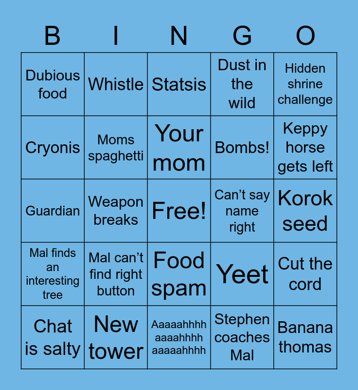 This bingo card has a free space and 24 words: Mal can’t find right button, New tower, Your mom, Chat is salty, Hidden shrine challenge, Dubious food, Cryonis, Whistle, Can’t say name right, Food spam, Bombs!, Guardian, Yeet, Cut the cord, Moms spaghetti, Stephen coaches Mal, Korok seed, Statsis, Keppy horse gets left, Weapon breaks, Banana thomas, Mal finds an interesting tree, Dust in the wild and Aaaaahhhh aaaahhhh aaaaahhhh.