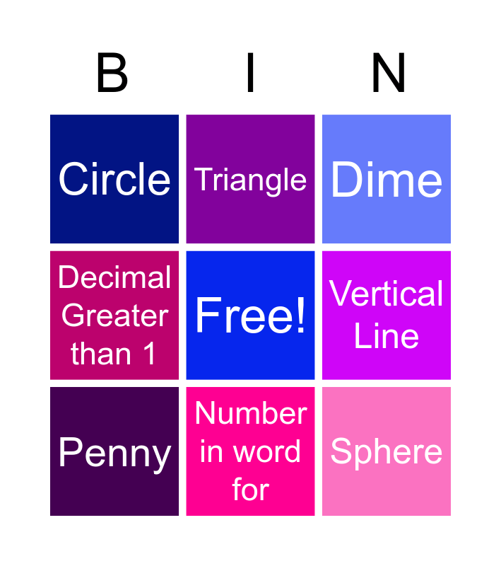 This bingo card has 1 images, a free space and 8 words: Penny, Triangle, Vertical Line, Circle, Dime, Decimal Greater than 1, Number in word for and Sphere.
