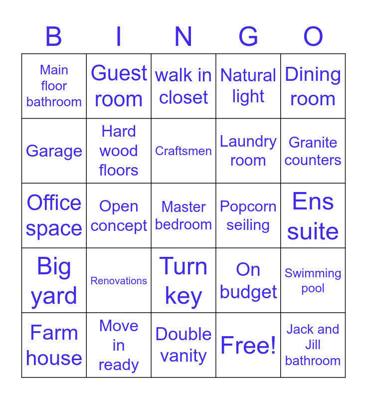 This bingo card has 30 words: Move in ready, White cabinets, Open concept, Farm house sink, Main floor bathroom, walk in closet, Hard wood floors, Turn key, Popcorn seiling, Double vanity, Ens suite, Master bedroom, Free!, Jack and Jill bathroom, Granite counters, Bonus room, On budget, Big yard, Renovations, Dining room, Office space, Carpet, Guest room, Laundry room, Garage, Natural light, Swimming pool, Farm house, Craftsmen and Price range.