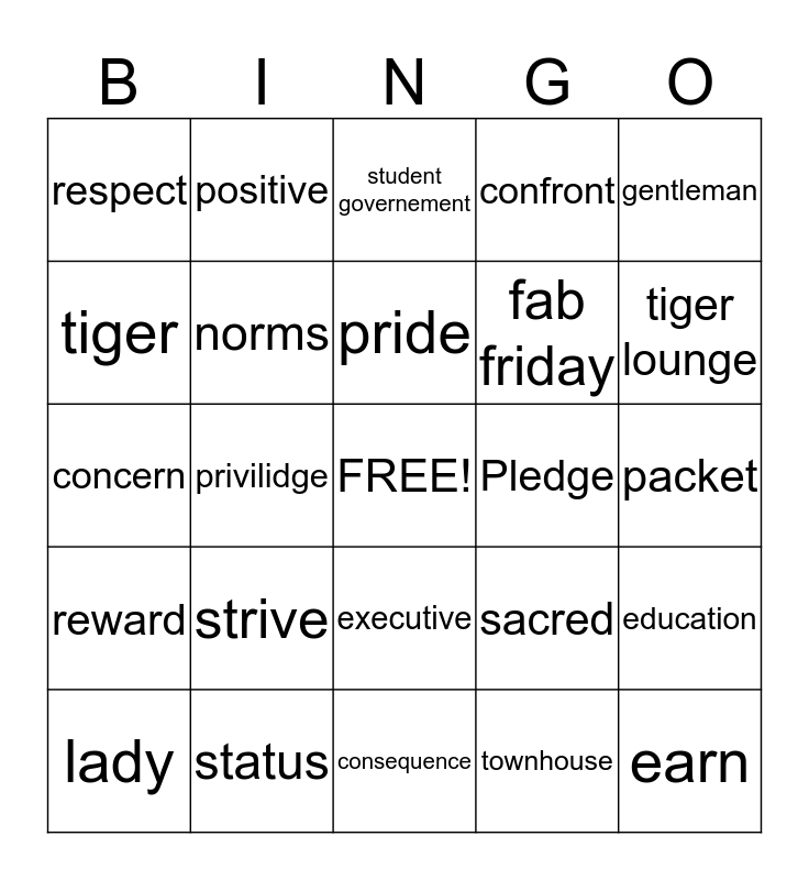 This bingo card has a free space and 24 words: strive, status, pride, lady, gentleman, respect, tiger, positive, Pledge, executive, fab friday, concern, sacred, education, norms, townhouse, packet, student governement, tiger lounge, privilidge, earn, reward, confront and consequence.