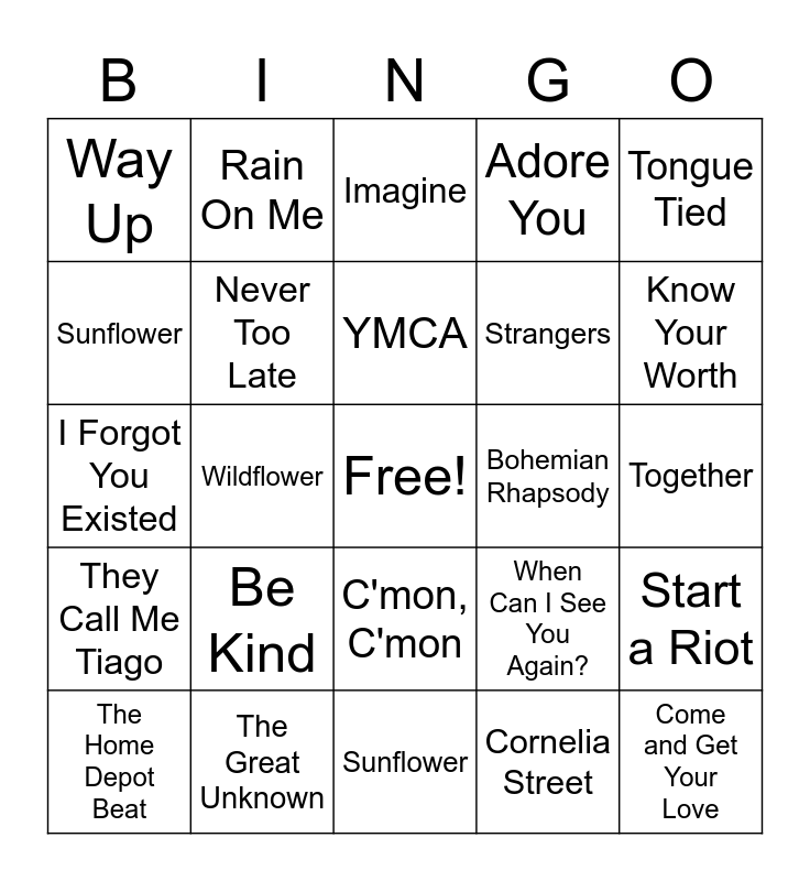 This bingo card has a free space and 102 words: Backyard Boy, Upside Down, Tongue Tied, Bulletproof, Savage Love, Gimme Love, Love Story, ily, Wait a Minute, Someone to You, Buttercup, Renee, Never Met!, What If, 50//50, Cradles, They Call Me Tiago, Watermelon Sugar, Dynamite, Blinding Lights, Don't Be Sad, Sunday Best, Summer Feelings, Break My Heart, Intentions, Know Your Worth, Adore You, Be Kind, If The World Was Ending, Forever, Rain On Me, Imagine, For a Minute, Agua, Farther We Go, C'mon, C'mon, Better Than Words, Cruel Summer, I Forgot You Existed, Cornelia Street, Daydream, You'll Always Find Your Way Back Home, The Home Depot Beat, Best Song Ever, Heart Attack, Live While We're Young, What Makes You Beautiful, Strangers, Mambo No. 5, NASA, Everybody Wants to Rule the World, I Said Stop, Sunflower, Year 3000, Push It to the Limit, Used to Be, Don't Throw it Away, Dog Days are Over, Send Me on My Way, Come and Get Your Love, 'Mood 4 Eva, Shake It Off, Baba O'Riley, Mountains, ABC, Midnight City, In Your Eyes, Together, Wildflower, The Great Unknown, Carry On, Good Day, The Way I Feel, Where I Belong, Try Everything, Remember Me, Never Too Late, Brown Skin Girl, Keys to Kingdom, Don't Stop Me Now, Never Ending Story, Young Forever, Dancing Queen, Bohemian Rhapsody, All Star, YMCA, We Are Family, I'm Still Standing, Happier, I Want You Back, Good Times, When Can I See You Again?, Catchy Song, Super Cool, What's Up Danger, Sunflower, Way Up, Familia, Start a Riot, Hide, Memories and Scared of the Dark.