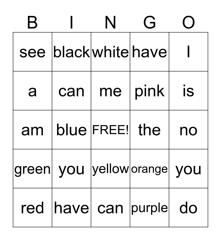 This bingo card has a free space and 24 words: you, have, me, red, I, see, a, black, the, yellow, pink, am, orange, you, can, purple, no, white, is, blue, do, green, have and can.