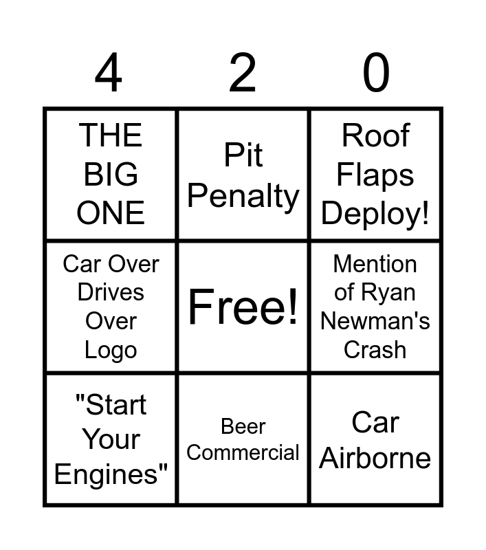 This bingo card has a free space and 17 words: "Aerial Coverage Brought to You by Good year", Pinty's Commercial, Roof Flaps Deploy!, THE BIG ONE, Toyota Wins a Stage, Car Over Drives Over Logo, Someone Drinks Coca-Cola, "Start Your Engines", Beer Commercial, Mention of Ryan Newman's Crash, COVID-19, Ford in 3rd, Car Airborne, Pit Penalty, Flat Tire, Erectile Dysfunction Commercial and Southern Hicks.