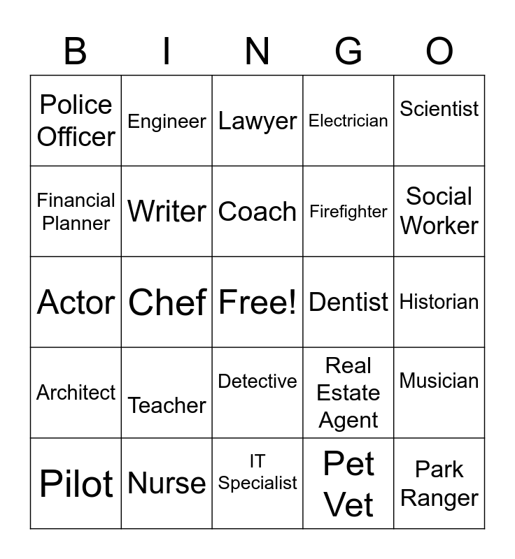 This bingo card has a free space and 24 words: Teacher, Nurse, Coach, Pilot, Scientist, Police Officer, Financial Planner, Engineer, Dentist, Detective, Firefighter, Actor, Real Estate Agent, Musician, Writer, Pet Vet, Historian, Lawyer, Social Worker, Chef, Park Ranger, Architect, Electrician and IT Specialist.