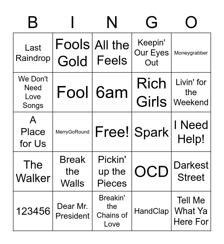 This bingo card has a free space and 34 words: Out of My League, HandClap, I Just Wanna Shine, Let Me Love You, The Walker, Fool, Moneygrabber, 123456, Fools Gold, Roll Up, 6am, All the Feels, Don't Gotta Work It Out, Burn It Down, Spark, Livin' for the Weekend, Dear Mr. President, A Place for Us, Break the Walls, OCD, Pickin' up the Pieces, Complicated, Last Raindrop, I Need Help!, Breakin' the Chains of Love, Tell Me What Ya Here For, Keepin' Our Eyes Out, L.O.V. - Live In Chicago, Rich Girls, We Don't Need Love Songs, House on Fire, MerryGoRound, Darkest Street and Get Away.
