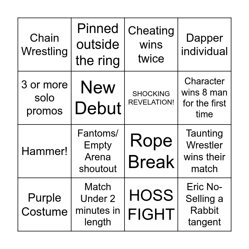 This bingo card has 16 words: Match Under 2 minutes in length, Taunting Wrestler wins their match, Cheating wins twice, Chain Wrestling, Hammer!, Pinned outside the ring, Rope Break, HOSS FIGHT, 3 or more solo promos, New Debut, Purple Costume, Dapper individual, Fantoms/ Empty Arena shoutout, Character wins 8 man for the first time, SHOCKING REVELATION! and Eric No-Selling a Rabbit tangent.