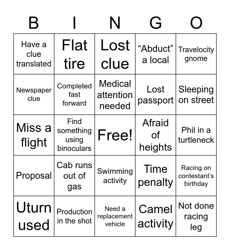 This bingo card has a free space and 34 words: India, Camel activity, Phil fakeout, Large sum of gross food, Proposal, Completed fast forward, Travelocity gnome, Uturn used, Flat tire, Can’t drive stick shift, Medical attention needed, Lost clue, Handling livestock, Hug Phil, Afraid of heights, Sleeping on street, Production in the shot, Miss a flight, Cab runs out of gas, Time penalty, Swimming activity, Run out of money, Have a clue translated, Phil in a turtleneck, Need a replacement vehicle, Not done racing leg, “Abduct” a local, Gets off a standby list, Lost passport, Newspaper clue, Observe something while traveling at a high speed, Find something using binoculars, Racing on contestant’s birthday and Bungeeing.