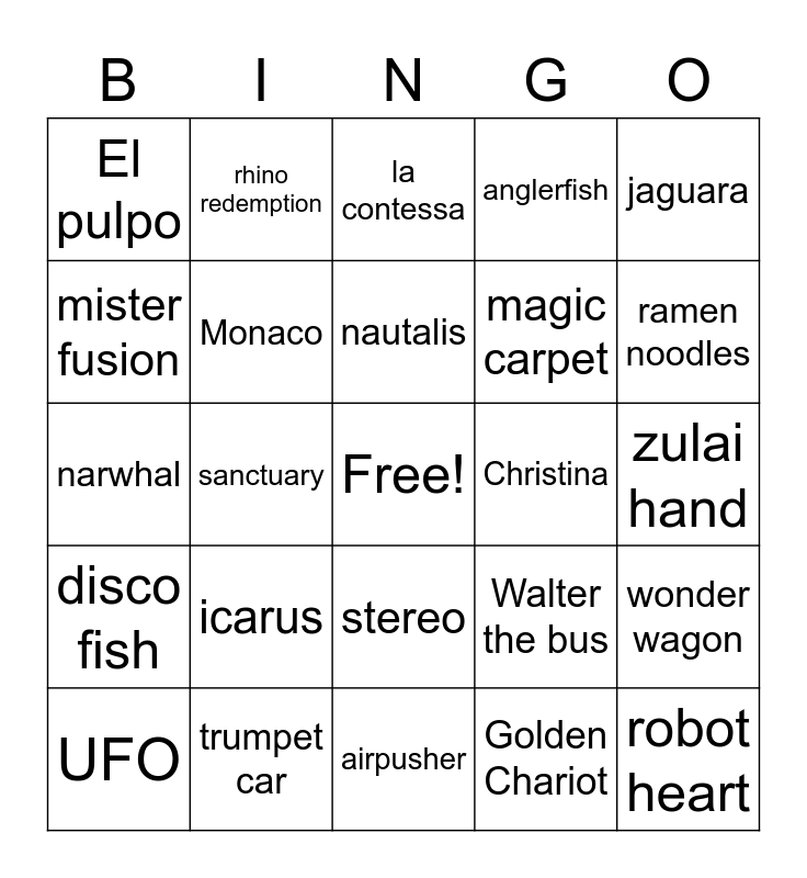 This bingo card has a free space and 50 words: Mayan warrior, robot heart, rabbit transit, airpusher, icarus, deep playa taxi, rhino redemption, big red, mister fusion, front porch, Monaco, anglerfish, wonder wagon, Walter the bus, the golden mean, madam astolabe, nautalis, Christina, Berserker, jaguara, sanctuary, Golden Chariot, El pulpo, magic carpet, disco duck, teapots, ramen noodles, chattering teeth, la contessa, stereo, top hat skull, roatary phone, seashell, converse shoe, trumpet car, cat cabanana ca, rcookie monster, silver shark, 747, zulai hand, cloud, flux, scorpian, parallelles, UFO, narwhal, chesire cat, golden gate bridge, disco fish and dragomi.