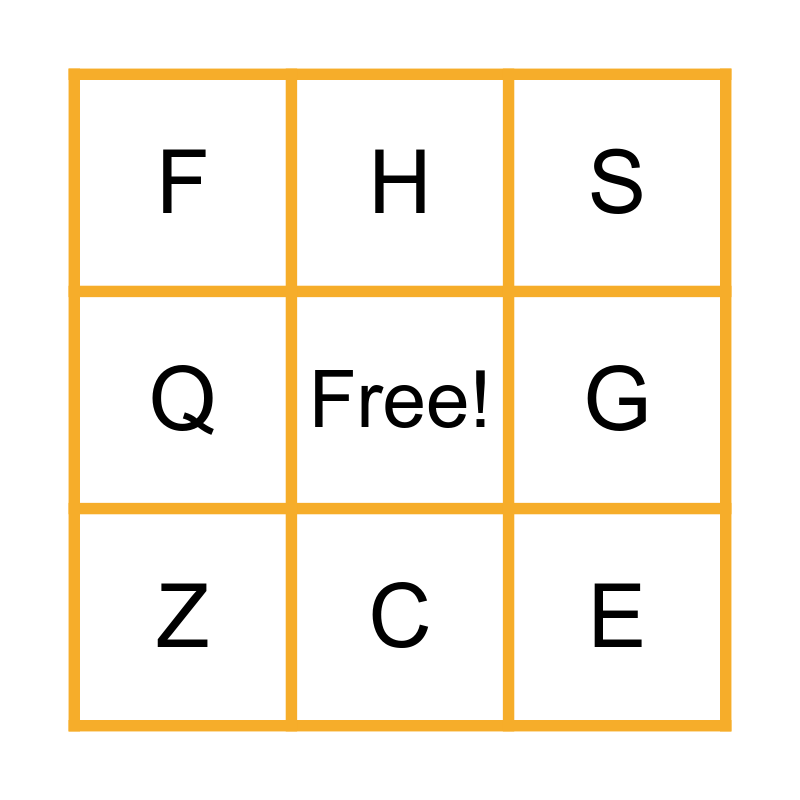 This bingo card has a free space and 26 words: A, B, C, D, E, F, G, H, I, J, K, L, M, N, O, P, Q, R, S, T, U, V, W, X, Z and Y.