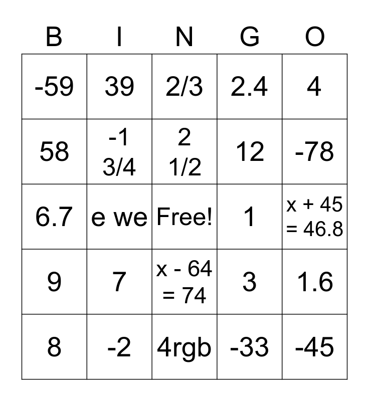 This bingo card has a free space and 24 words: 7, -2, 2 1/2, 8, 4, -59, 58, 39, 1, x - 64 = 74, 12, 6.7, 3, 1.6, -1 3/4, -33, x + 45 = 46.8, 2/3, -78, e we, -45, 9, 2.4 and 4rgb.