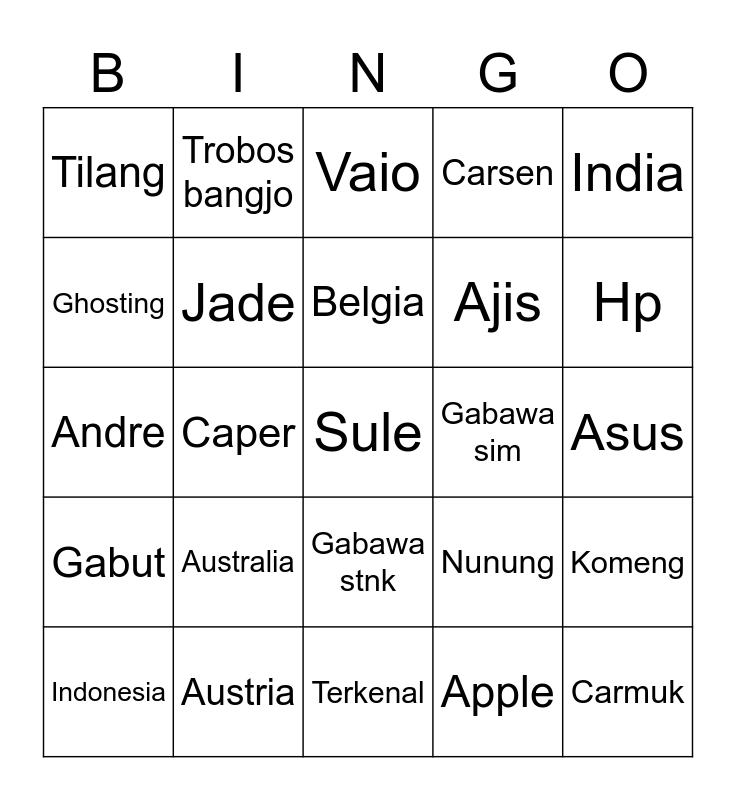 This bingo card has a free space and 24 words: Australia, Austria, Belgia, Indonesia, India, Tilang, Ghosting, Trobos bangjo, Gabawa sim, Gabawa stnk, Ajis, Andre, Nunung, Komeng, Jade, Apple, Asus, Vaio, Hp, Caper, Carmuk, Gabut, Carsen and Terkenal.