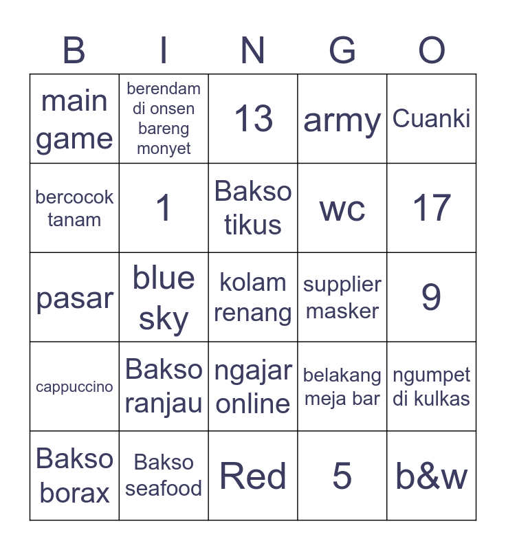 This bingo card has a free space and 24 words: Bakso ranjau, Bakso seafood, Bakso tikus, Bakso borax, Cuanki, main game, bercocok tanam, berendam di onsen bareng monyet, supplier masker, ngajar online, wc, pasar, belakang meja bar, ngumpet di kulkas, 1, 5, 9, 13, 17, blue sky, b&w, cappuccino, army and Red.
