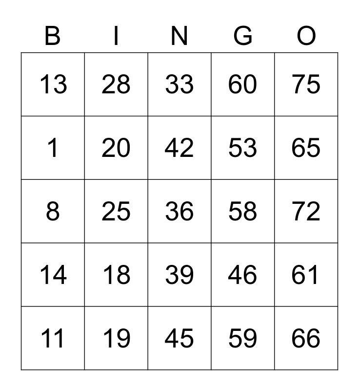 This bingo card has a free space and 24 words: 11, 18, 42, 59, 75, 13, 28, 33, 58, 72, 8, 20, 46, 61, 1, 19, 45, 60, 65, 14, 25, 39, 53 and 66.