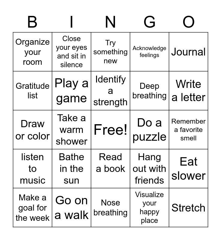 This bingo card has a free space and 24 words: Bathe in the sun, Go on a walk, Identify a strength, Make a goal for the week, Journal, Organize your room, Gratitude list, Close your eyes and sit in silence, Do a puzzle, Read a book, Deep breathing, Draw or color, Hang out with friends, Eat slower, Play a game, Visualize your happy place, Remember a favorite smell, Try something new, Write a letter, Take a warm shower, Stretch, listen to music, Acknowledge feelings and Nose breathing.