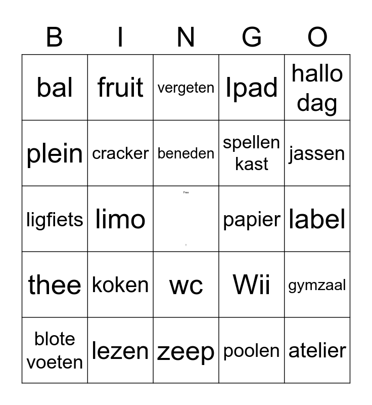 This bingo card has a free space and 34 words: skeeler, helpen, handen drogen, kleed, label, plein, cracker, zeep, spellen kast, atelier, ligfiets, fruit, poolen, biblio theek, thee, limo, wc, papier, gymzaal, blote voeten, lezen, handen wassen, Ipad, jassen, step, koken, vergeten, verveling, hallo dag, bal, smeren, beneden, Wii and schorten.