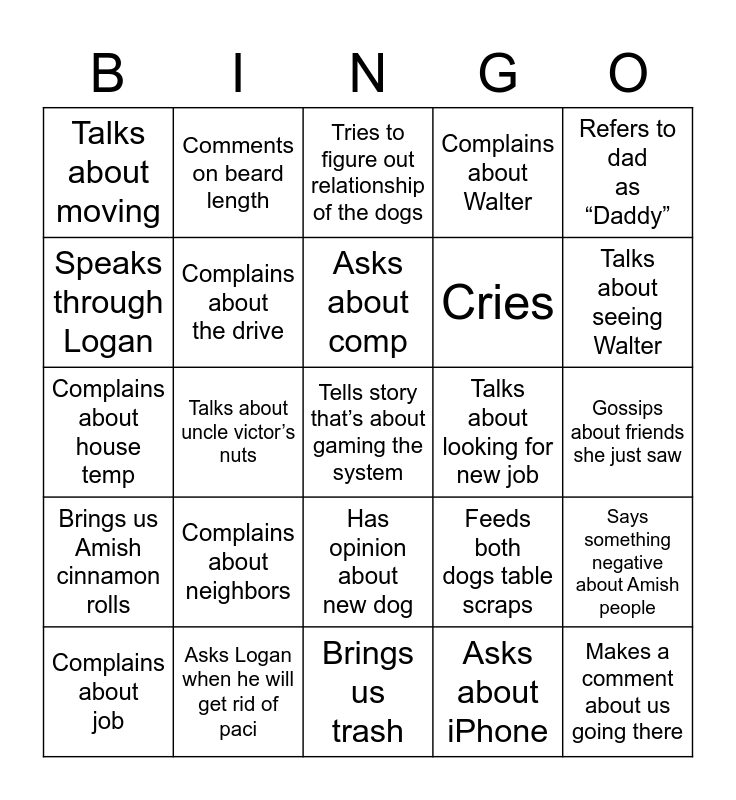 This bingo card has a free space and 24 words: Complains about job, Complains about neighbors, Asks about comp, Asks about iPhone, Refers to dad as “Daddy”, Talks about moving, Comments on beard length, Tries to figure out relationship of the dogs, Talks about looking for new job, Gossips about friends she just saw, Complains about house temp, Complains about the drive, Feeds both dogs table scraps, Says something negative about Amish people, Speaks through Logan, Asks Logan when he will get rid of paci, Brings us trash, Complains about Walter, Talks about seeing Walter, Brings us Amish cinnamon rolls, Talks about uncle victor’s nuts, Has opinion about new dog, Cries and Makes a comment about us going there.