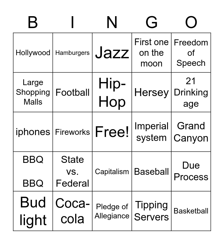 This bingo card has a free space and 33 words: Democracy, Flags, Fireworks, SUVs, BBQ BBQ, Football, Freedom of Speech, Bud light, Hamburgers, Hotdogs, Hip-Hop, Jazz, Bald Eagles, NASCAR, Imperial system, 21 Drinking age, Coca-cola, iphones, State vs. Federal, Baseball, Capitalism, Gun violence, Hollywood, Grand Canyon, Pledge of Allegiance, Basketball, First one on the moon, Hersey, Large Shopping Malls, Due Process, Ranch Derssing, Tipping Servers and Bill of rights.