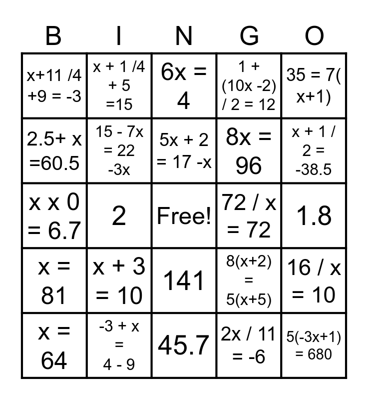 This bingo card has a free space and 24 words: x + 3 = 10, -3 + x = 4 - 9, 5x + 2 = 17 -x, x = 64, 35 = 7( x+1), x+11 /4 +9 = -3, 2.5+ x =60.5, x + 1 /4 + 5 =15, 72 / x = 72, 141, 8x = 96, x x 0 = 6.7, 8(x+2) = 5(x+5), 16 / x = 10, 15 - 7x = 22 -3x, 2x / 11 = -6, 1.8, 6x = 4, x + 1 / 2 = -38.5, 2, 5(-3x+1) = 680, x = 81, 1 + (10x -2) / 2 = 12 and 45.7.