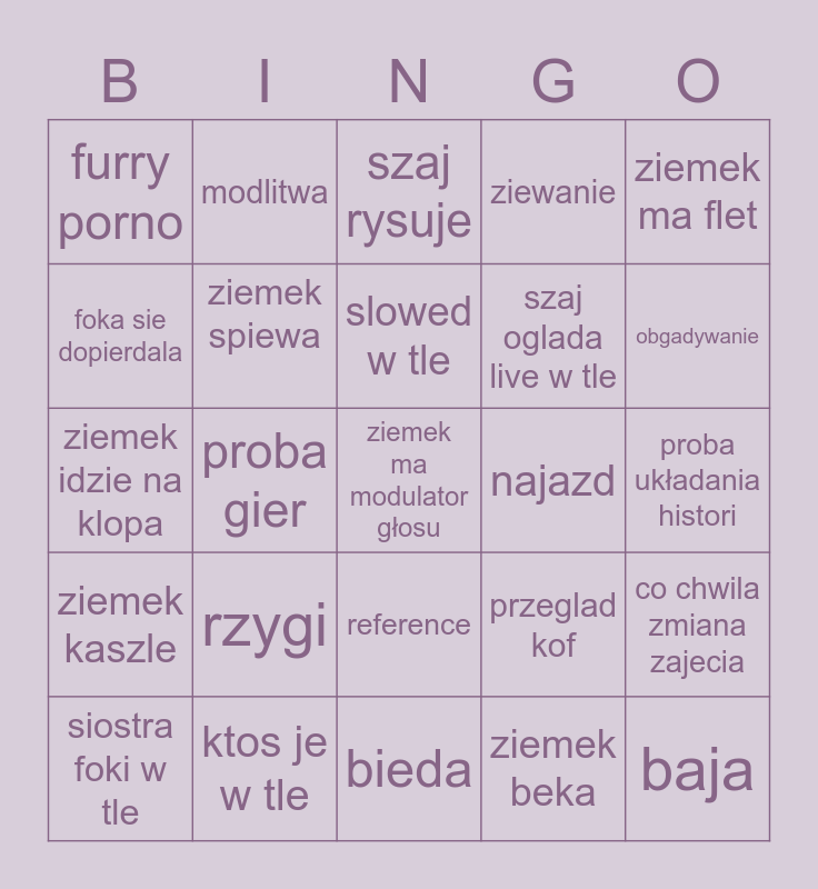 This bingo card has a free space and 24 words: rzygi, ktos je w tle, slowed w tle, siostra foki w tle, ziemek ma flet, furry porno, foka sie dopierdala, modlitwa, najazd, reference, szaj oglada live w tle, ziemek idzie na klopa, przeglad kof, co chwila zmiana zajecia, ziemek spiewa, ziemek beka, proba układania histori, szaj rysuje, obgadywanie, proba gier, baja, ziemek kaszle, ziewanie and bieda.