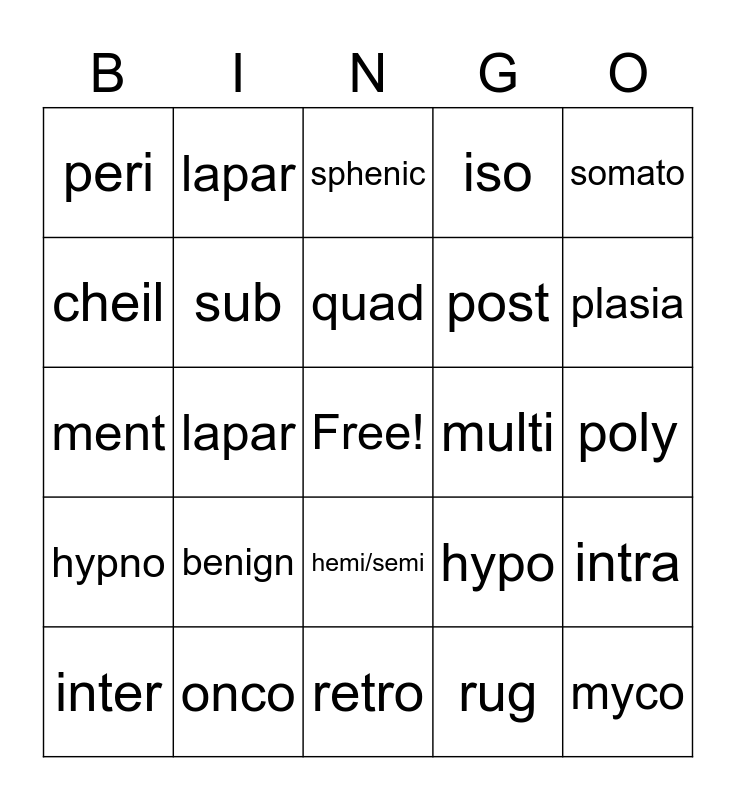 This bingo card has a free space and 35 words: viscero, trachel, hyper, sub, hemi/semi, iso, cheil, dys, quad, malign, ment, somato, anti, steno, peri, multi, rug, lapar, hypno, myco, hypo, inter, intra, onco, sphenic, plasia, melan, scler, post, poly, pre, retro, benign, lapar and adnexa.