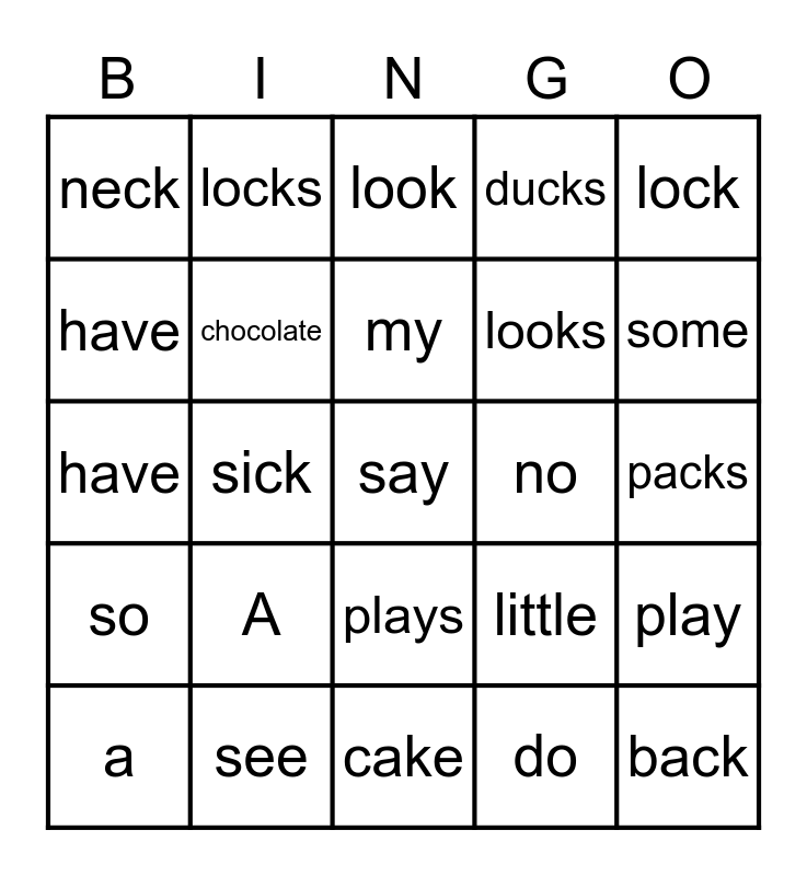 This bingo card has a free space and 29 words: a, you, sick, go, neck, look, chocolate, A, no, see, packs, back, cake, do, some, oh, plays, so, lock, have, little, some, looks, have, ducks, locks, play, my and the.
