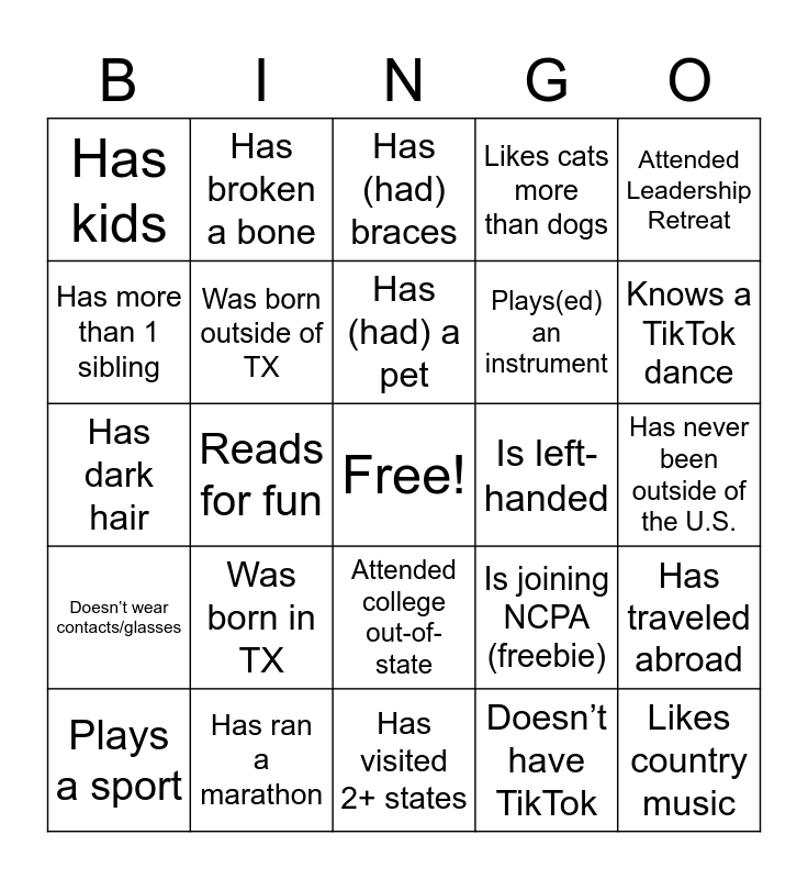 This bingo card has a free space and 25 words: Was born in TX, Has visited 2+ states, Has (had) a pet, Plays a sport, Attended Leadership Retreat, Has kids, Has more than 1 sibling, Has broken a bone, Is left-handed, Attended college out-of-state, Plays(ed) an instrument, Has dark hair, Is joining NCPA (freebie), Has traveled abroad, Was born outside of TX, Can speak a foreign language, Has never been outside of the U.S., Has (had) braces, Knows a TikTok dance, Reads for fun, Likes country music, Has ran a marathon, Doesn’t wear contacts/glasses, Likes cats more than dogs and Doesn’t have TikTok.