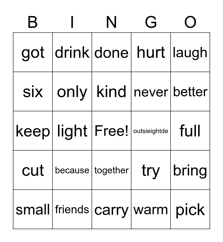 This bingo card has a free space and 24 words: because, friends, kind, small, laugh, got, six, drink, outsieightde, together, never, keep, try, bring, only, warm, full, done, better, light, pick, cut, hurt and carry.