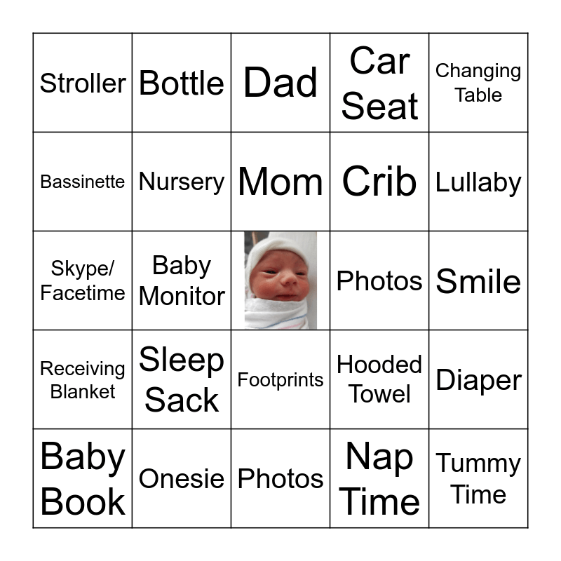 This bingo card has a free space and 32 words: Nap Time, Bouncy Chair, Baby Monitor, Booties, Receiving Blanket, Nursery, Changing Table, Diaper, Bottle, Rattle, Mom, Dad, Stroller, Teddy Bear, Photos, Dance Party, Baby Book, Skype/ Facetime, Footprints, Sleep Sack, Hooded Towel, High Chair, Smile, Onesie, Tummy Time, Car Seat, Crib, Bassinette, Stroller, Photos, Burp Cloth and Lullaby.