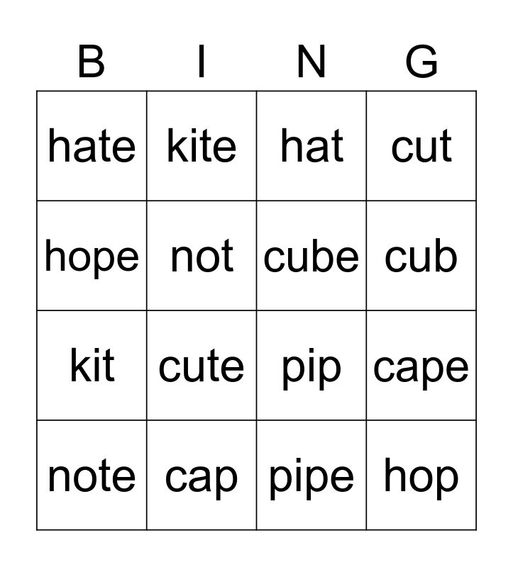 This bingo card has 16 words: cap, cape, hat, hate, kit, kite, pip, pipe, hope, not, note, cut, cute, cub, cube and hop.