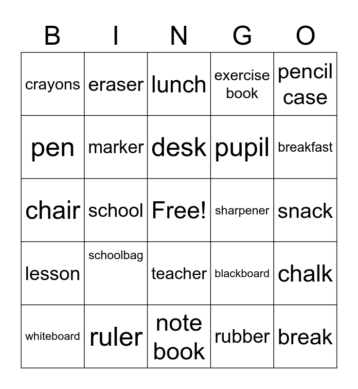 This bingo card has a free space and 24 words: schoolbag, ruler, desk, whiteboard, pencil case, crayons, pen, eraser, sharpener, teacher, pupil, chair, blackboard, chalk, marker, rubber, snack, lunch, breakfast, school, break, lesson, exercise book and note book.